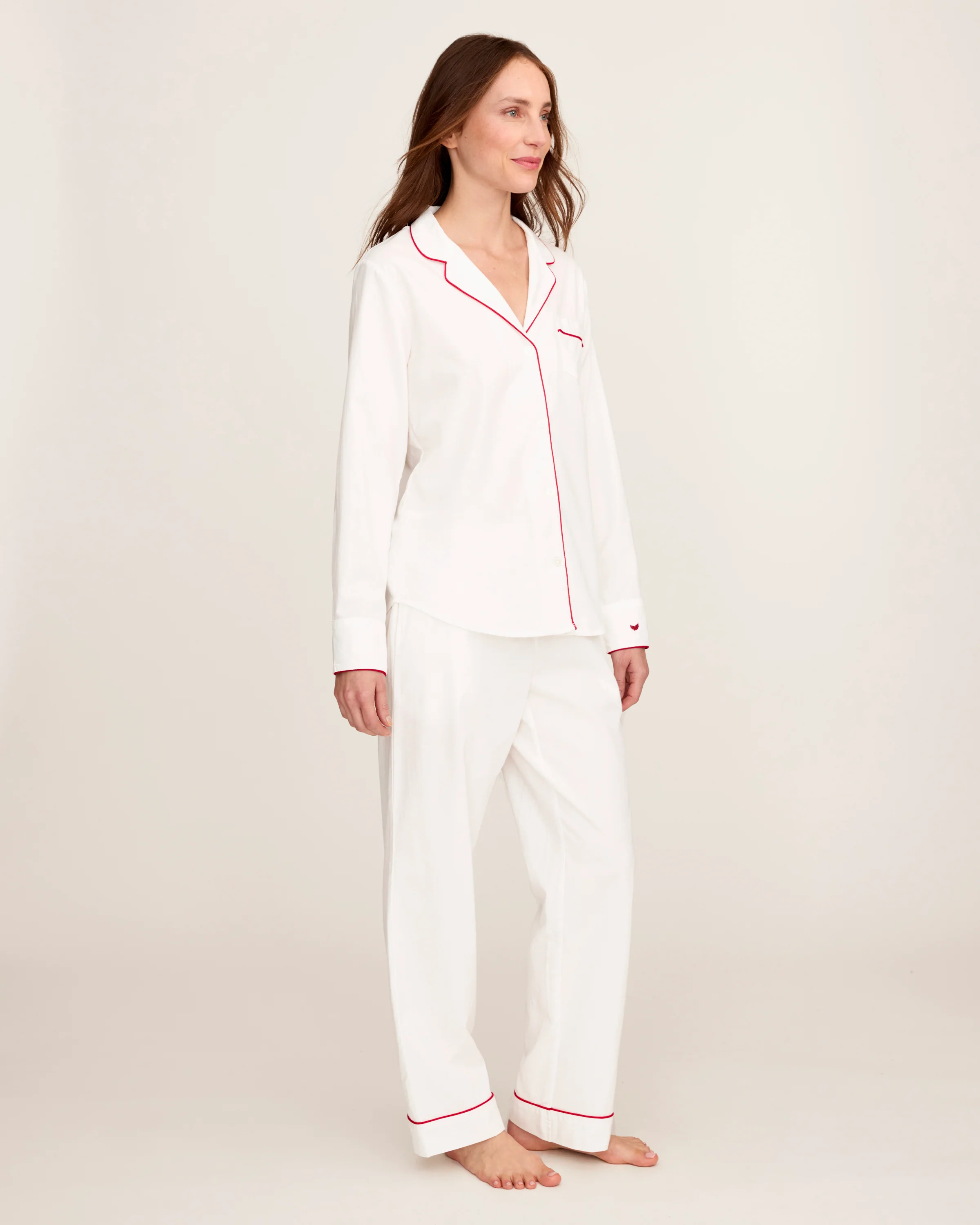 Women's Twill Pajama Set in White with Red Piping