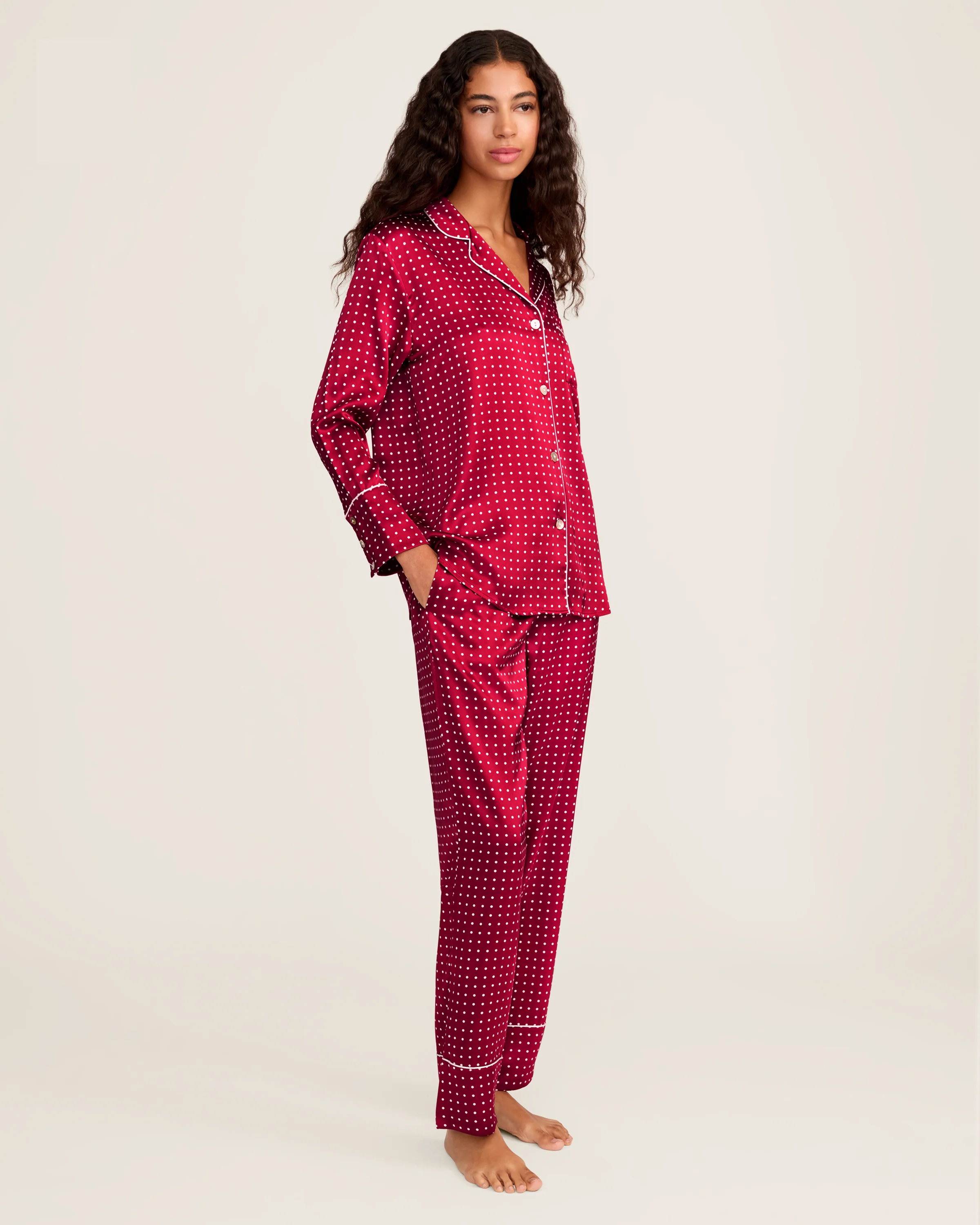 Women's Silk Pajama Set in Bordeaux Polka Dot