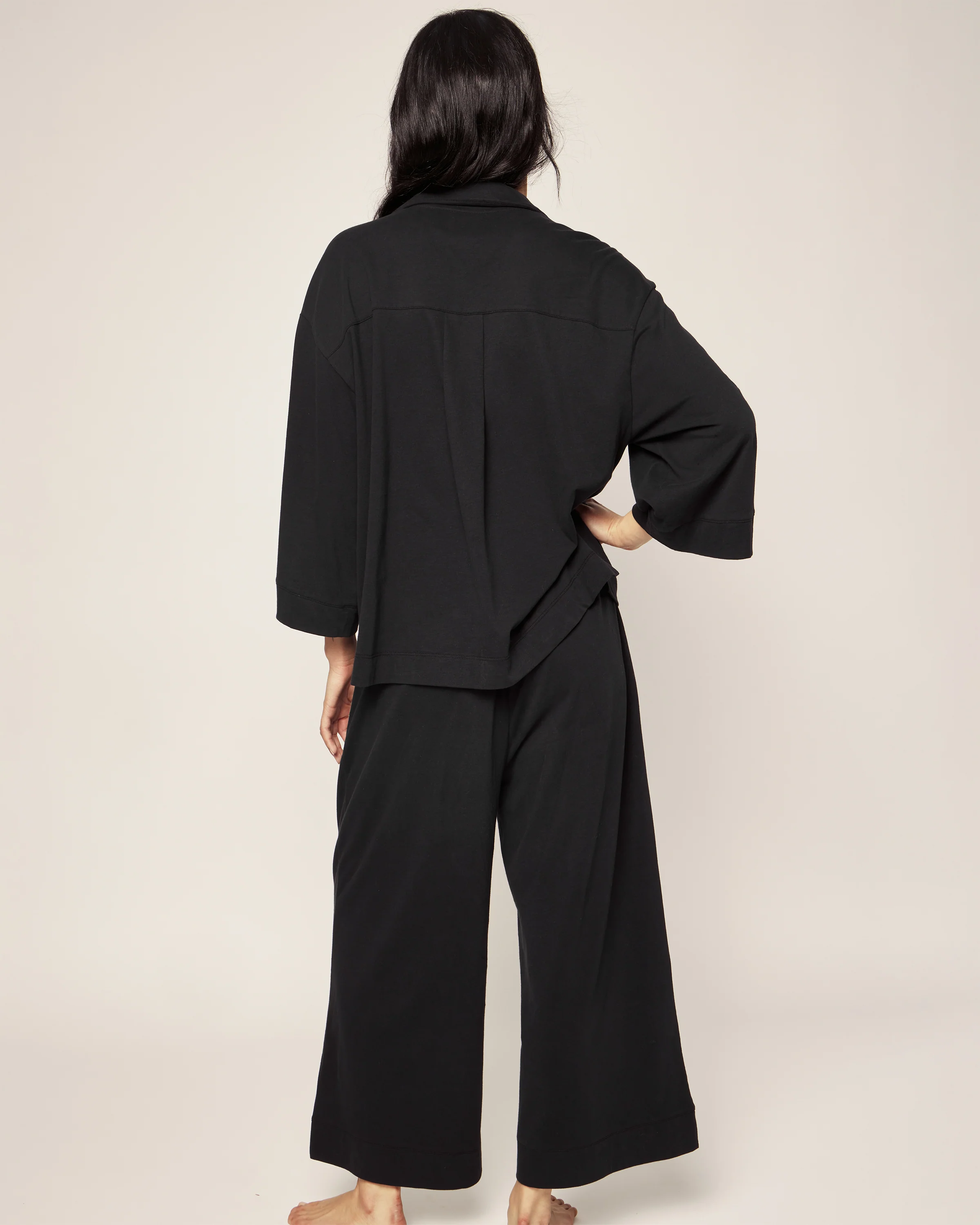 Our wide-leg Pima Cotton pajama set is the apex of comfort and feminine tailoring: a well-considered three-quarter length sleeve, for example, and a more generous pant leg that results in that refined swish-swish sensation at your ankle as you walk down a long hallway.